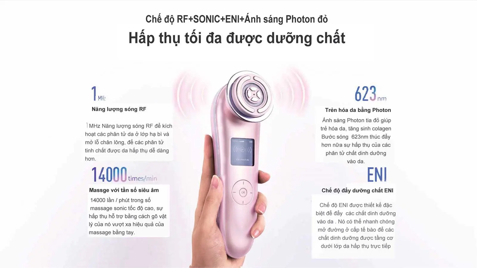 - Ánh sáng đỏ bước sóng 623 nm tùy chỉnh chuyên nghiệp với RF, đẩy dưỡng chất ENI, đồng bộ hóa chức năng nâng cơ EMS, tăng cường hiệu quả trẻ hóa da, Làm sạch sâu, ngăn ngừa mụn, cân bằng mỡ và độ ẩm cho da, đi sâu vào các tế bào da giảm các vết mụn thu nhỏ lỗ chân lông giúp da mịn màng,kích hoạt trẻ hoá da, làm da sáng ….