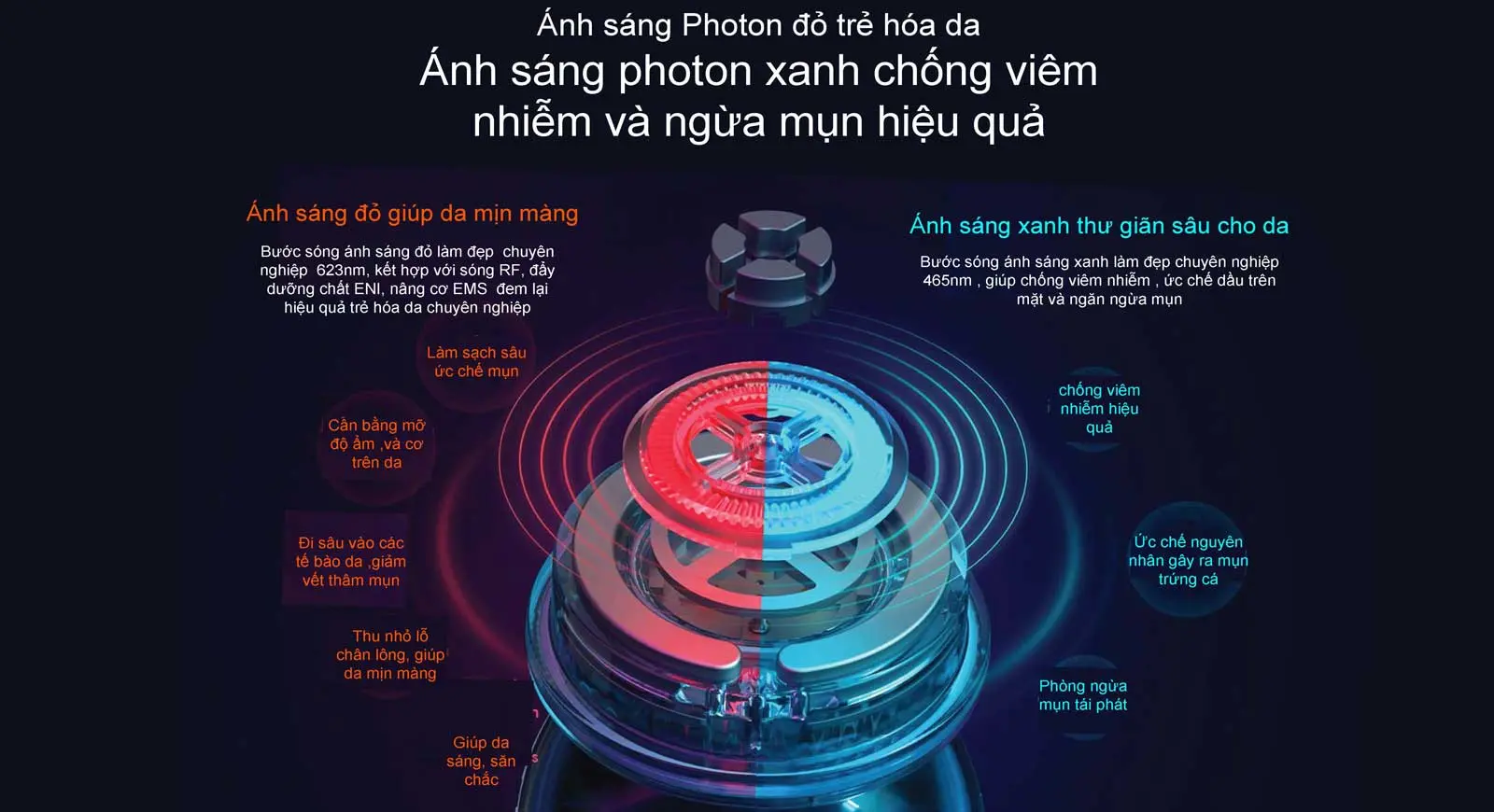 - Ánh sáng đỏ làm trẻ hóa làn da và ánh sáng xanh khử trùng và an thần luân phiên nhau.